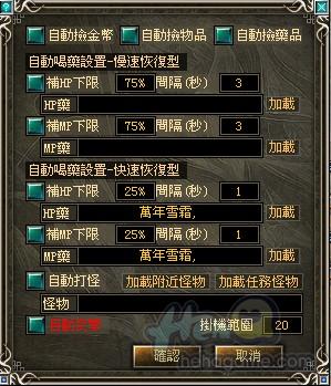 自動撿取物品,自動喝藥水等等貼切的服務,讓你的人物可以在任何時候安心的修煉。當然,你要小心其他玩家的仇殺。不過,在特定的掛機地圖是不允許PK的喔,所以你可以在那安心的修煉喔。