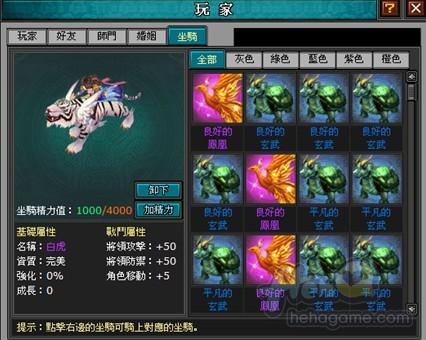 完美白虎坐騎其原始屬性:+50將領攻擊,+50將領防禦,+5角色速度。單從屬性來看就比同一品質的鳳凰多出了10點的將領攻擊和將領防禦了,再加上其珍貴之處,真的令人神魂顛倒啊。
