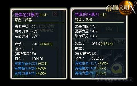 帝國文明改版後由原來的強化+10增加到+15,屬性也有很大的提升。我們今天就以70級的特異狂暴刀來作介紹,到底+10與+15有多大區別。